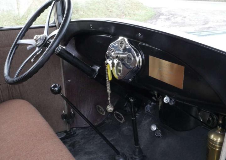 Lovely in blue and black, excellent body, paint and chrome, very tidy engine bay, lovely refurbished cloth interior, rubber floor mat, starts easily, stops and drives very well. Was imported from the US in 2017 where it belonged to the ex-resident of the AACA (Antique Automobile Club of America), restored in USA including engine re-build, radiator, hoses and battery all look newish, good tyres, flashing indicators, recent ignition components and rebuilt petrol gauge. Seen service with a film hire company, comes with V5, Instruction Book, wiring diagram, vintage petrol can, brass fire extinguisher and a few tools. Great fun.
