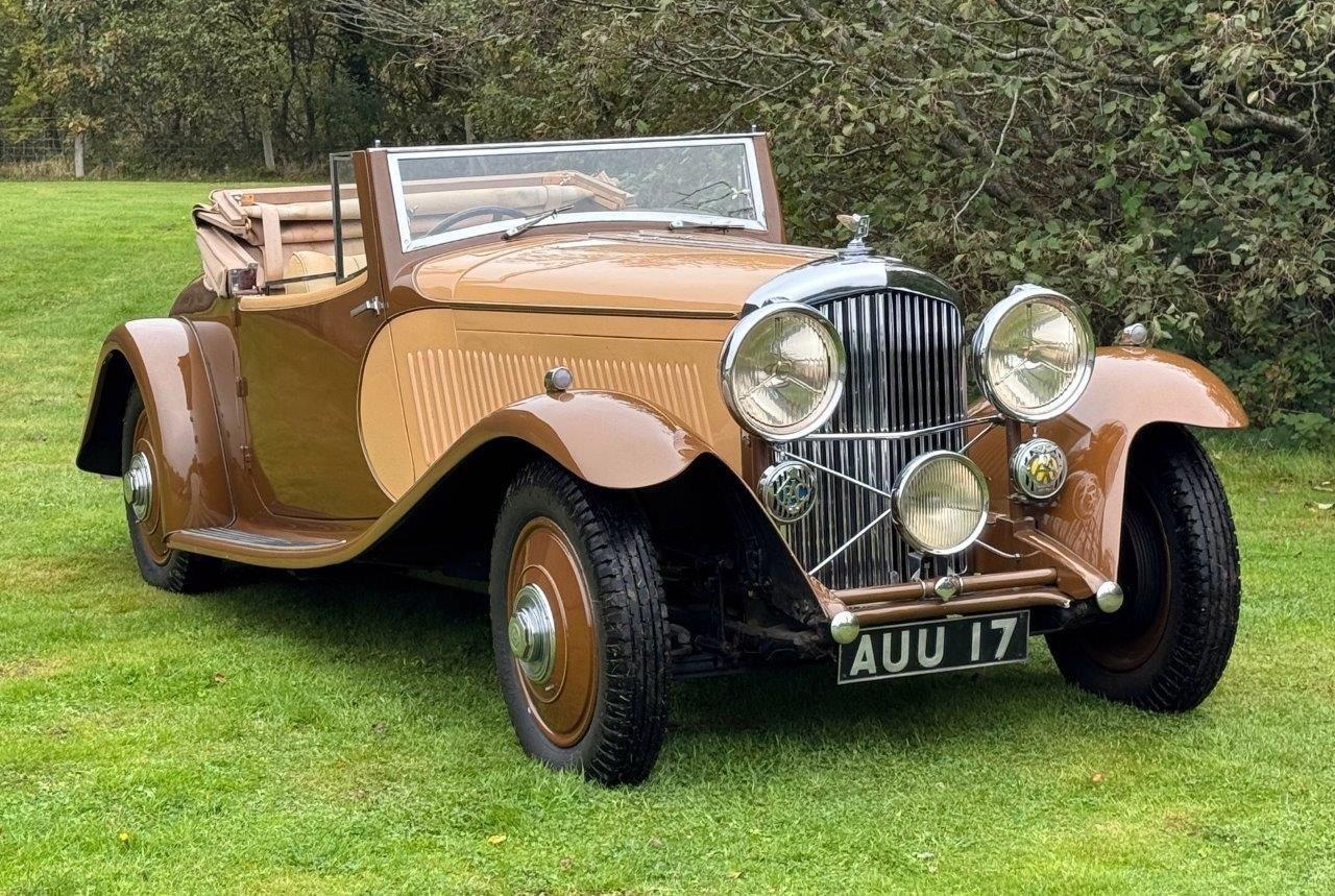 A very striking Derby Bentley which incorporates various unusual and very appealing design features. Sporty in appearance, sharp and lovely in condition and running very well. One of the very first Derby Bentleys built, originally bodied by Park Ward, the current Barker body was built for a slightly later 3½ Litre in 1935, but transferred to this car in the 1950s. The car features very sleek wing design, shallow windscreen, some very attractive body mouldings and swage lines to the scuttle and bonnet (which are also louvred), the rear quarters and the doors, too have sweeping, curved lines, enhanced by colour division. Early photos of the body when mounted on B178DG, although black & white, suggest a very similar colour scheme to that still on the car. These photos, together with shots of various documentation, an old logbook, etc, can be seen on the 'More Photos' page. The paintwork, chrome plating, upholstery, woodwork and cosmetics generally are all excellent, and the fitment of a full set of 'Ace' wheel discs and a 'clam shell' spare wheel cover, correct P100 headlights,the facility for mounting luggage on the lid of the already quite spacious boot, all add to the car's practicality. Excellent, probably unique and a very rare opportunity to acquire such a special specimen. The car has a recent aluminium cylinder head and we have just fitted five new tyres and heavy duty tubes. Serviced, prepared and offered newly MoT tested.