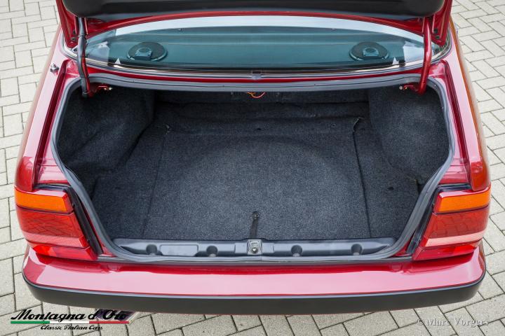 Lancia Thema Ferrari 8.32, jaar 1988. Chassisnummer ZLA834000*00158436*, motornummer F1050046*16585*. Exterieur in rood metallic (Rosso Winner 179/F) gecombineerd met een zwartlederen interieur van Poltrona Frau en grijs tapijt.