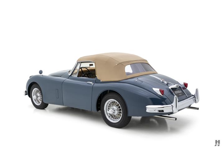 As part of the restoration, the car was refinished in a Cotswold Blue over a beautifully trimmed tan leather interior, complemented by a tan canvas convertible top. The result of the restoration is a charming XK150, with deep, lustrous paintwork that highlights the flowing lines of the XK150’s body. Chrome and brightwork are beautifully presented, while the car rolls on chrome wire wheels secured with knock-off hubs, completing the classic Jaguar sporting appearance.