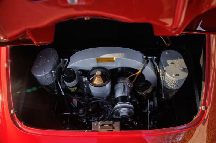 Under its most recent owner, the Super 90 GT was the recipient of a cosmetic and mechanical restoration between 2020 and 2022. There are numerous Carrera GT items to note- including the oil line holes in the passenger side fender well where the feed and return lines to the oil cooler would reside in a four-cam engine-equipped Carrera GT. The aluminum panels open and close smoothly, and the GT engine lid includes the internal ducting designed for the four-cam Carrera motor. Riveted bi-metal KPZ wheels are present and include a matching spare at the front trunk compartment, alongside the correctly finished GT fuel tank, fittings, and jack. In the cabin, care was taken to select materials that were correct to the original specification, including the black leatherette and corduroy upholstery over aluminum GT seats and the back factory roll bar.